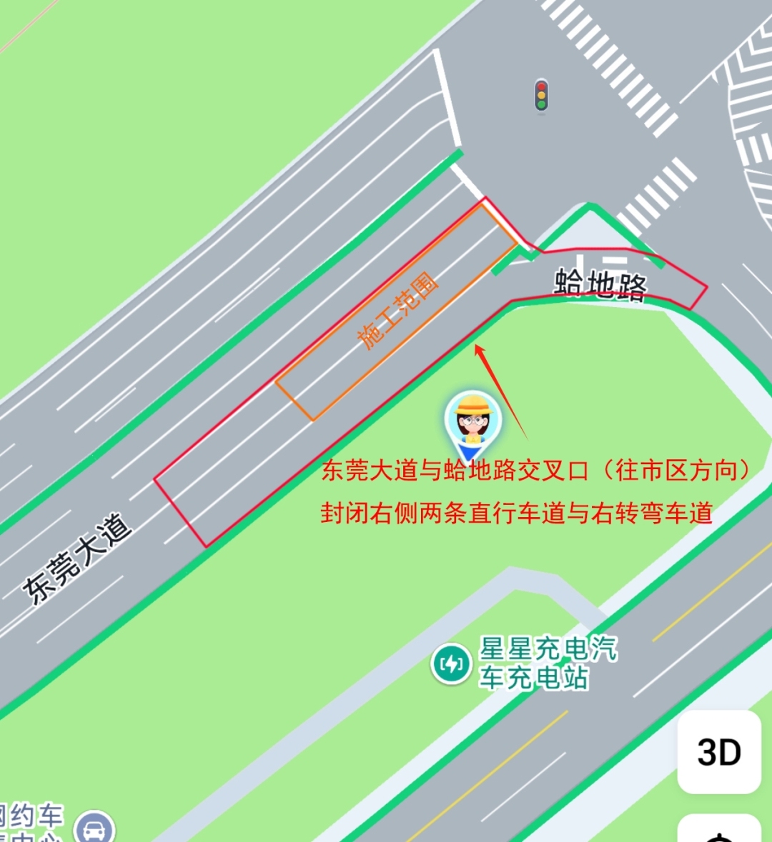 · 封闭范围:科创路转东莞大道右转车道、莞太路往东莞大道右转车道、东莞大道(往市区方向)转蛤地路右侧三车道