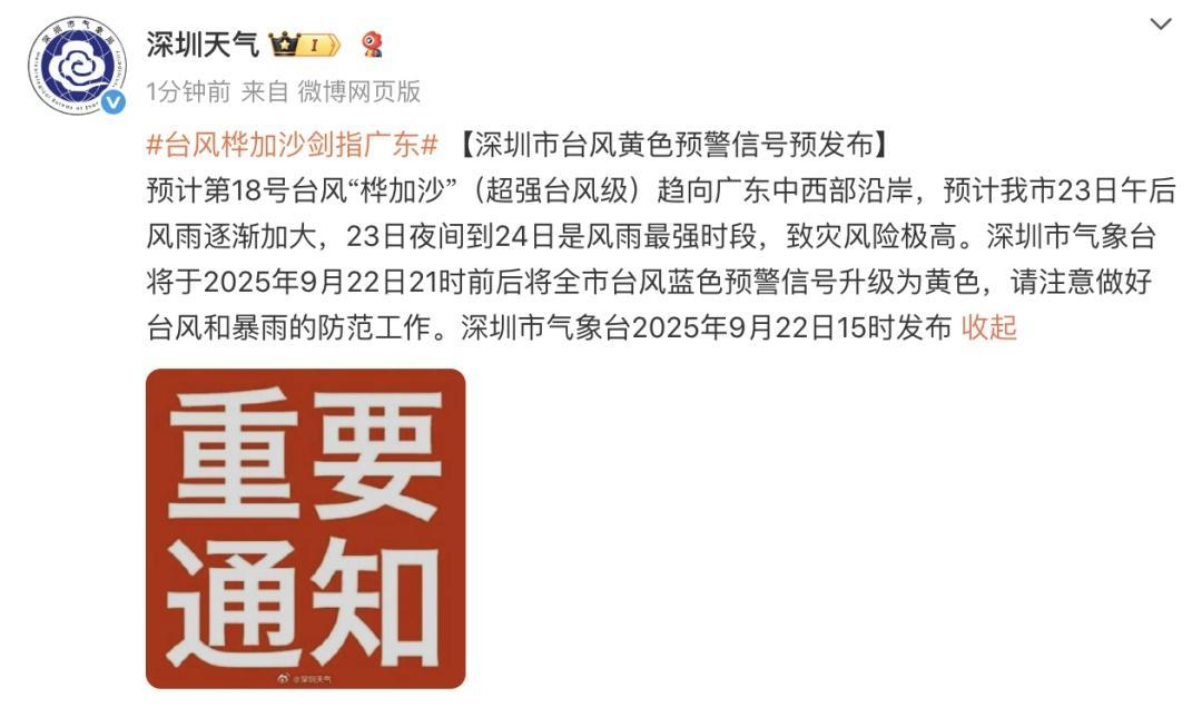 预计第18号台风“桦加沙”(超强台风级)趋向广东中西部沿岸,预计我市23日午后风雨逐渐加大,23日夜间到24日是风雨最强时段,致灾风险极高。深圳市气象台将于2025年9月22日21时前后将全市台风蓝色预警信号升级为黄色,请注意做好台风和暴雨的防范工作。深圳市气象台2025年9月22日15时发布