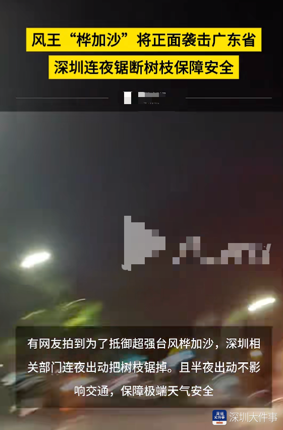 昨晚,有网友拍到为了抵御超强台风桦加沙,深圳相关部门连夜出动把树枝锯掉,“半夜出动不影响交通,保障极端天气安全”。