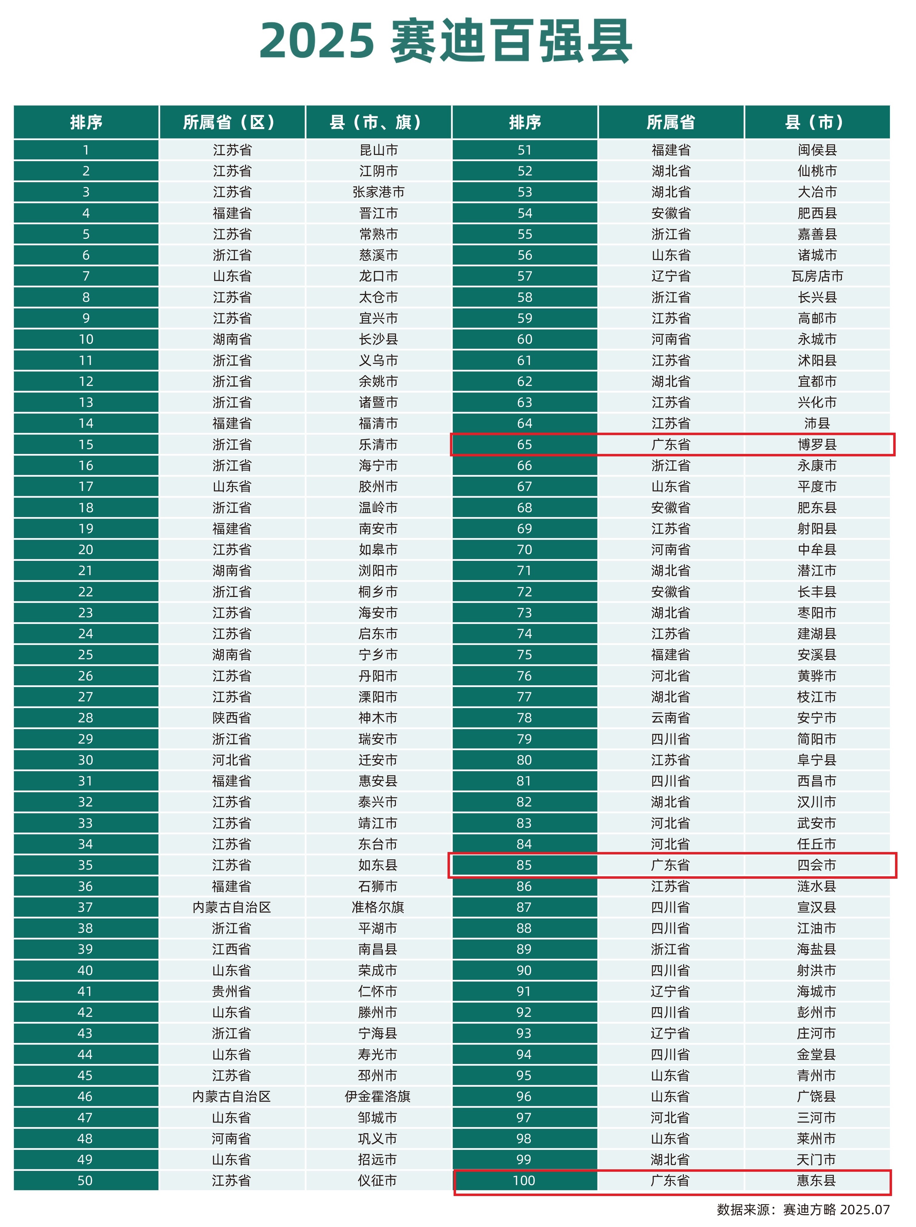 相较上一年,今年广东上榜县市中除惠州博罗县、肇庆四会市外,新增惠州惠东县(第100位)。博罗县位次由去年的第66位晋升1位,四会市则晋升2位至第85位。