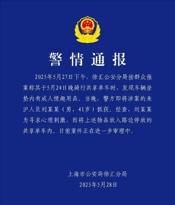 2025年5月27日下午,徐汇公安分局接群众报案称其于5月24日晚骑行共享单车时,发现车辆坐垫内有成人情趣用品。