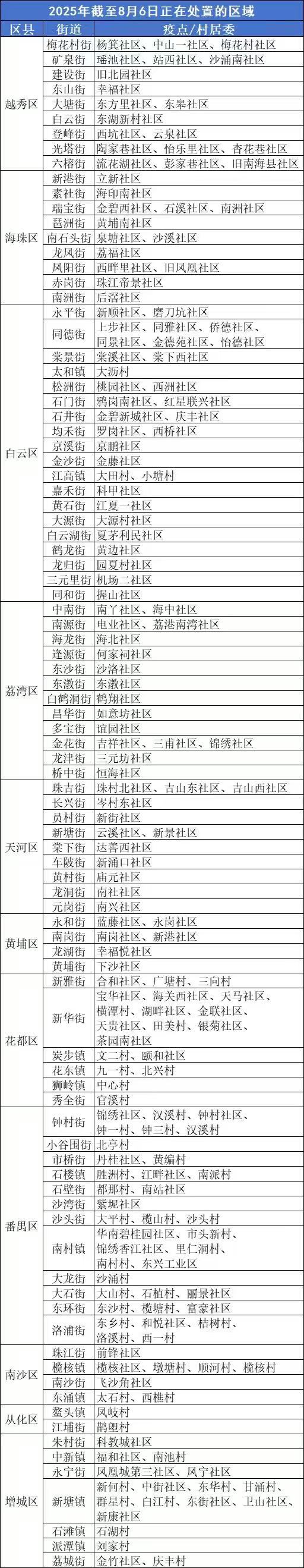 8月7日,广州市疾病预防控制中心提醒,截至8月6日,以下区域正在开展蚊媒传染病疫情处置,存在传播风险,请注意防蚊灭蚊。