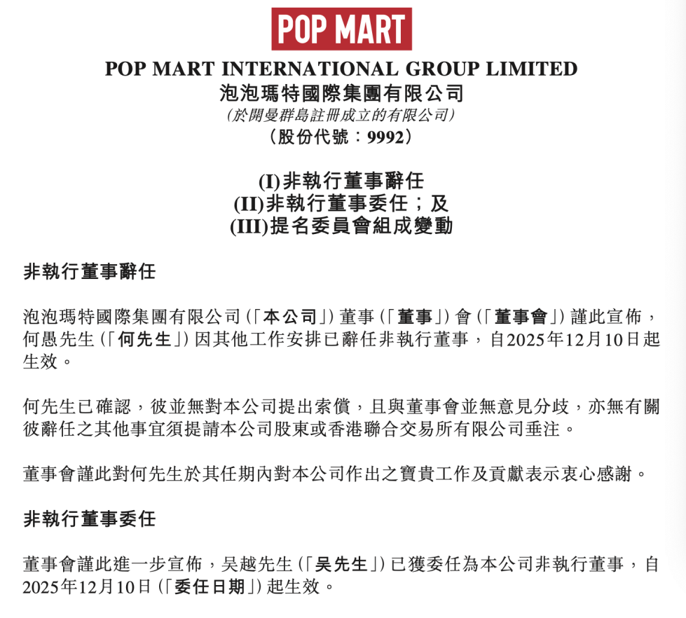 泡泡玛特董事会迎来奢侈品高管。12月10日,泡泡玛特发布公告称,何愚先生因其他工作安排已辞任公司非执行董事职位,自2025年12月10日起生效。吴越先生已获委任为公司非执行董事,自2025年12月10日起生效。