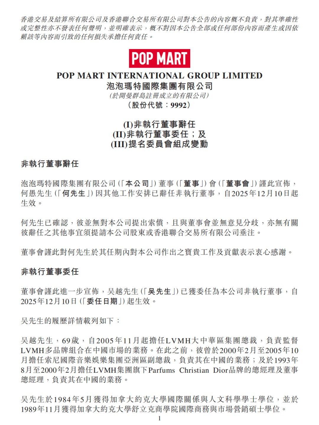 12月10日,泡泡玛特的一则公告在资本市场投下了一粒颇为耀眼的石子:69岁的LVMH大中华区集团总裁吴越,接替黑蚁资本管理合伙人何愚,出任公司非执行董事。