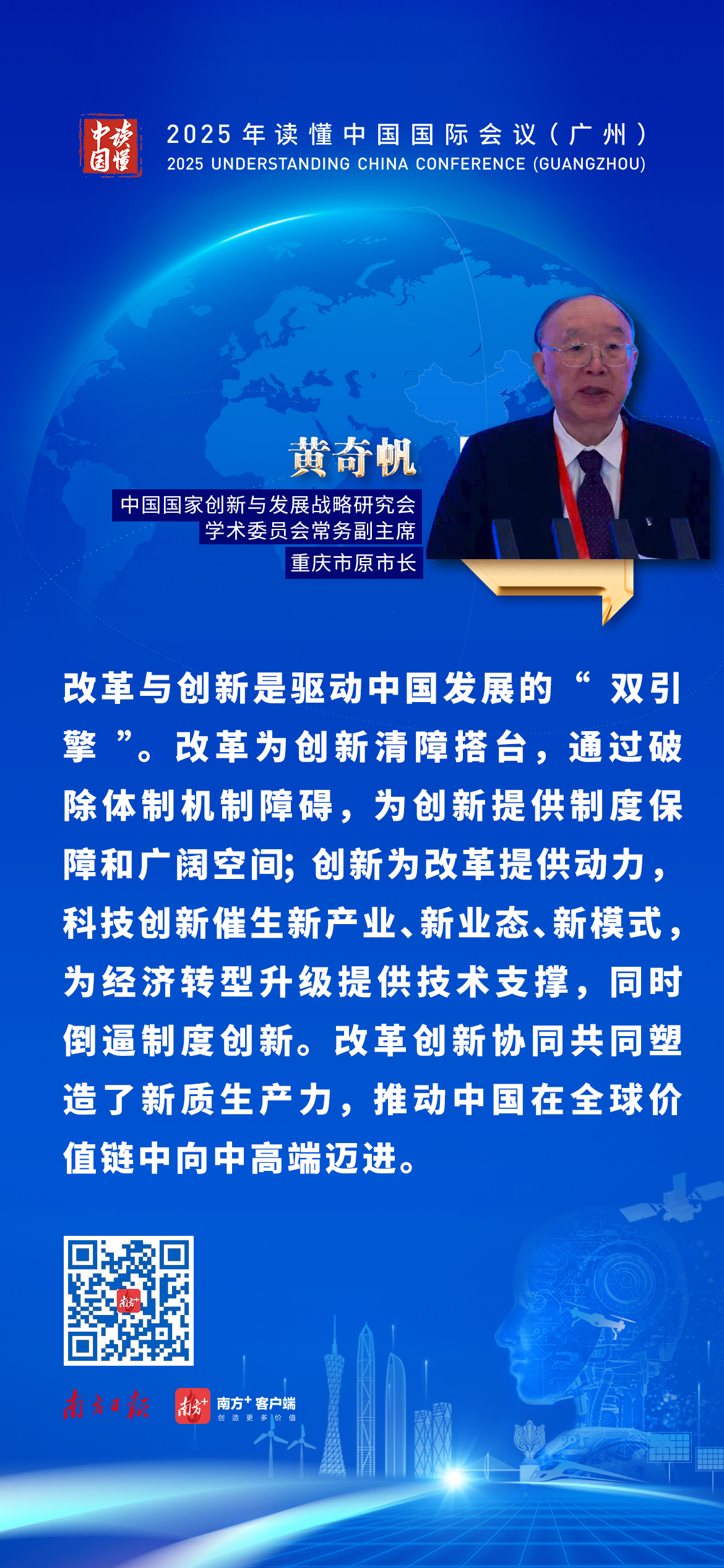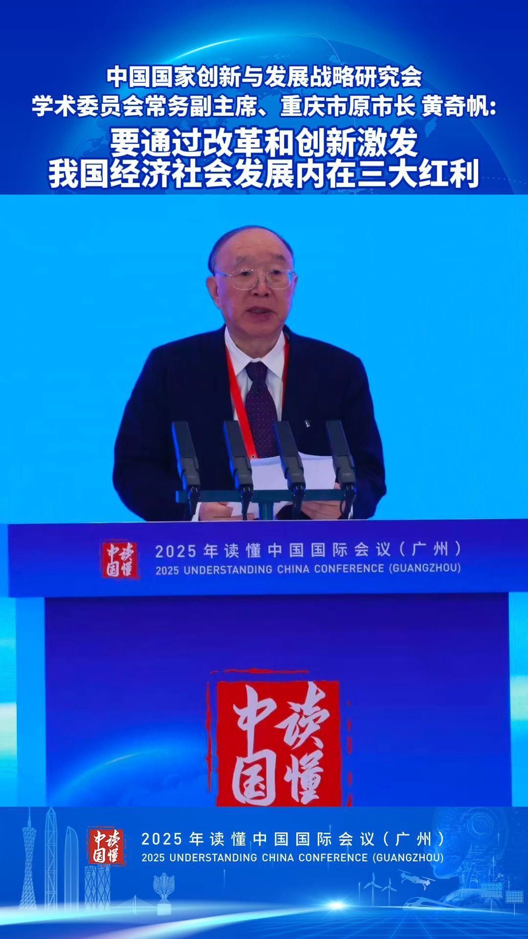 12月1日上午,2025年“读懂中国”国际会议开幕式在广州举行。中国国家创新与发展战略研究会学术委员会常务副主席、重庆市原市长黄奇帆作大会演讲。