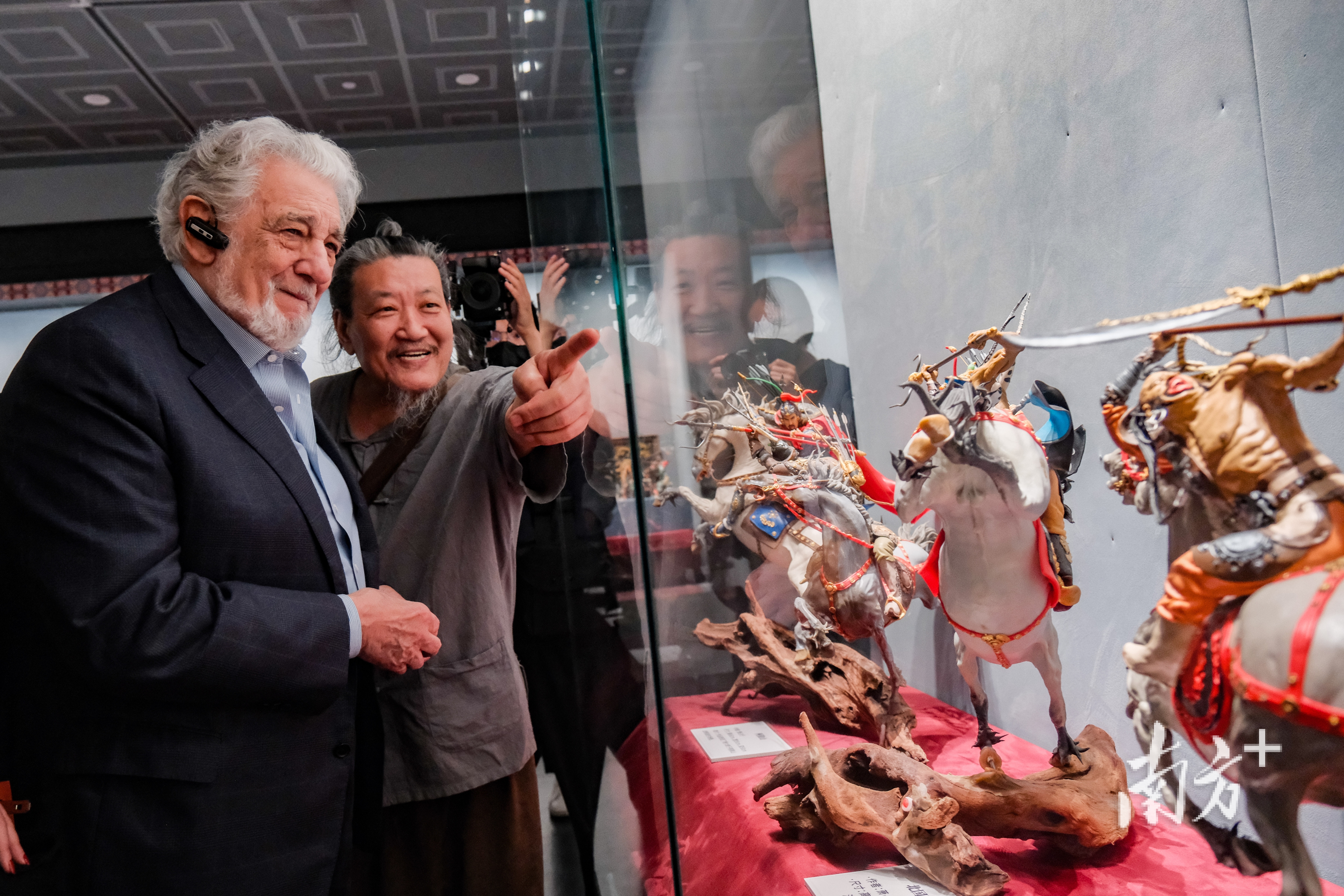 多明戈参观广州市文化馆面塑作品展时,还与萧派面塑第四代传承人进行了交流,感受非遗技艺的魅力。他对馆内展示的面塑技艺赞叹不已:“它蕴含中国很多传统的文化和历史故事,而且制作精细,有的作品要历时几个月才能制作完成,非常了不起。”
