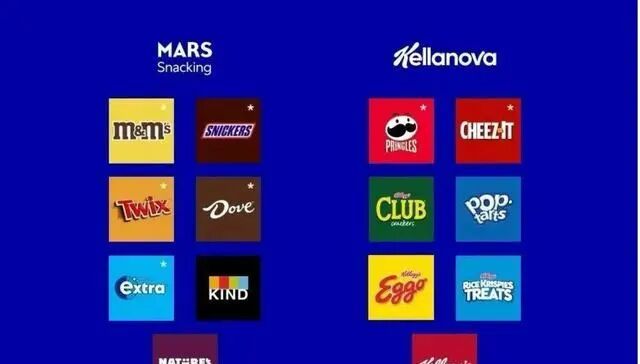 公开资料显示,跨国公司玛氏公司(MARS)由私人家族弗兰克·马尔斯于1911年创立,总部位于美国弗吉尼亚州。公司主要业务涉及零食类(糖果巧克力)、宠物类、主食和电子产品的制造和营销。玛氏旗下拥有60多个品牌,其中包括德芙、绿箭、士力架、彩虹糖、M&M's、脆香米、益达等知名品牌。Kellanova旗下则拥有家乐氏谷物、品客薯片、Cheez-It等食品品牌。