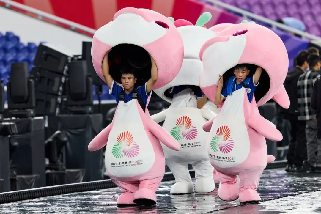 2025年11月9日,广州,全运会吉祥物玩偶服里的武校学生。(视觉中国/图)