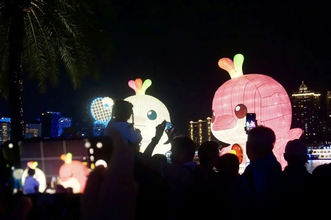 2025年11月17日,广州灯光节,观众们围观全运会吉祥物。(南方周末记者 苏有鹏/图)