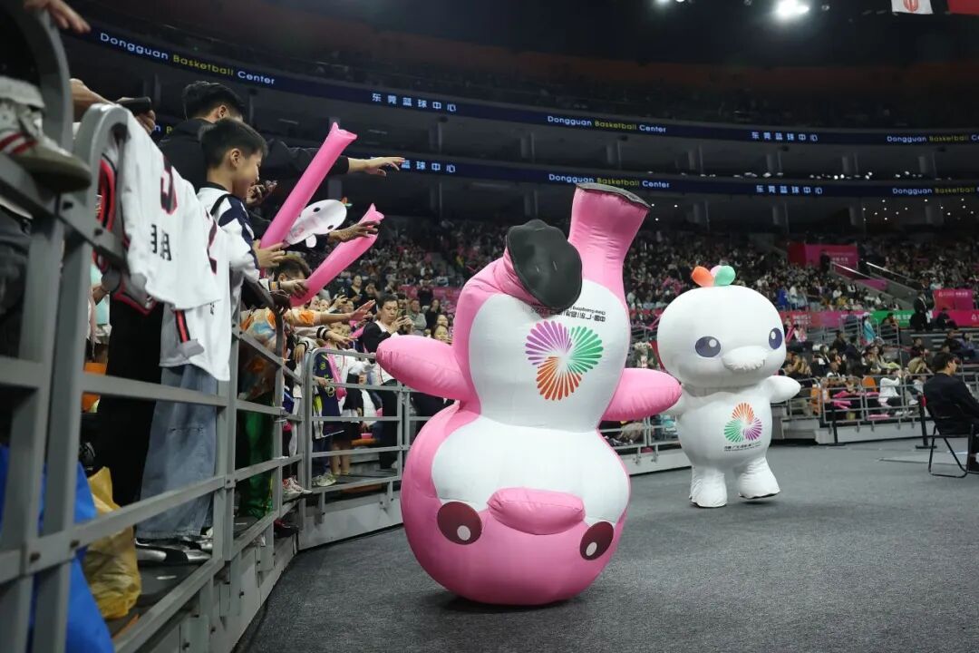 前一种吉祥物是毛绒外形,扮演者是来自登封市少林鹅坡武术学校和佛山市黄飞鸿国际文武学校的40位学生,后者则是充气公仔,扮演者是街舞演员和志愿者,在东莞篮球中心,他们留下了大量瞬间。