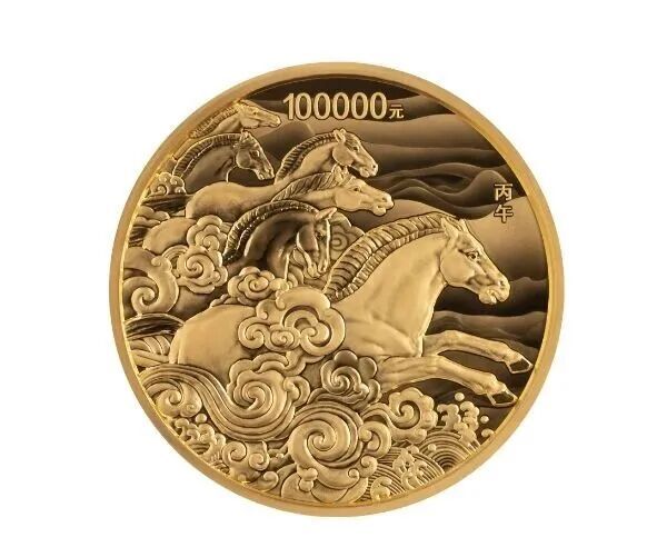 10公斤圆形金质纪念币背面图案为群马奔腾造型,衬以祥云、山、水纹组合设计;