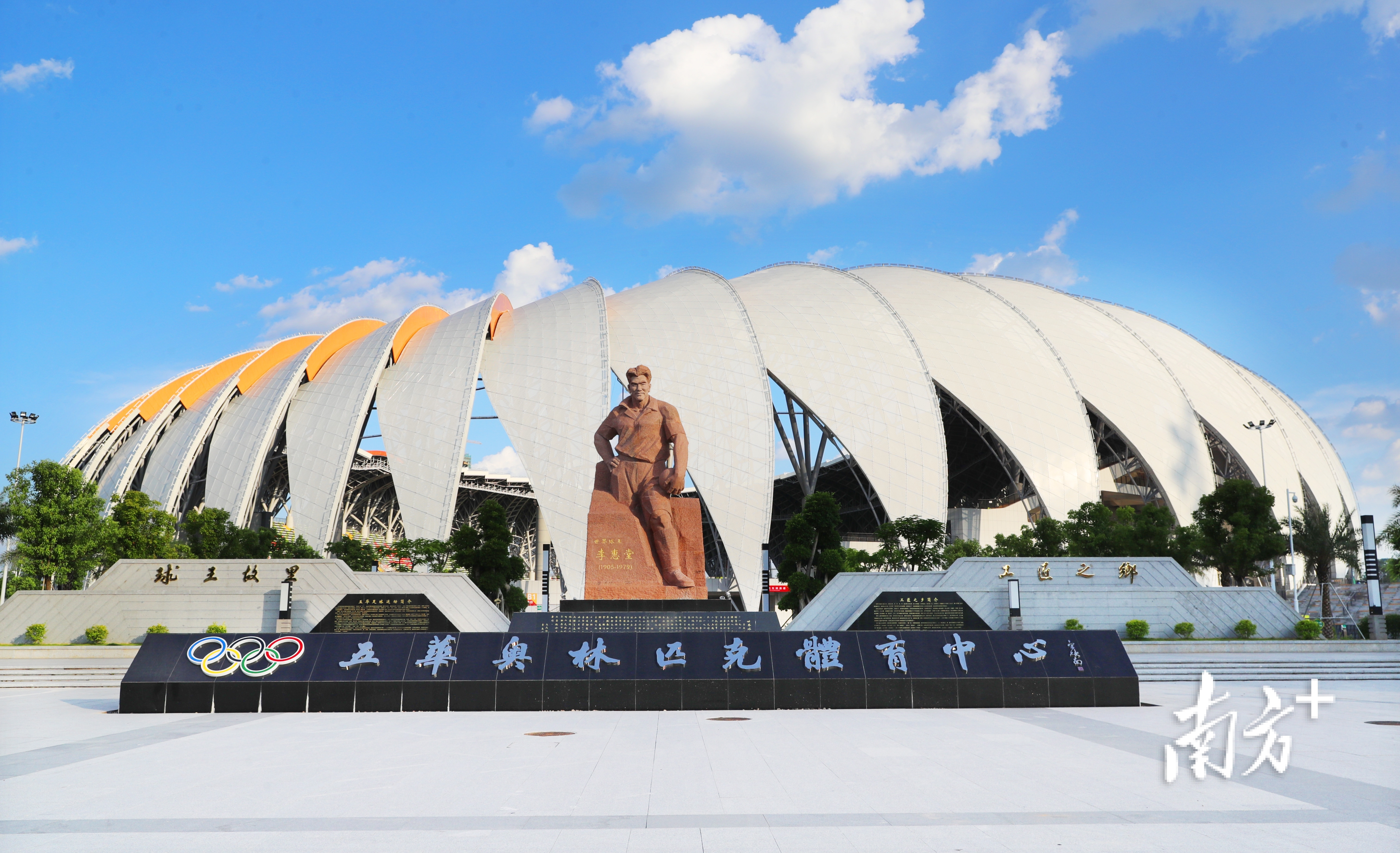 五华奥林匹克体育中心前的李惠堂雕像,由传承五华石雕工艺的平南杨家兄弟雕琢而成。 受访者供图