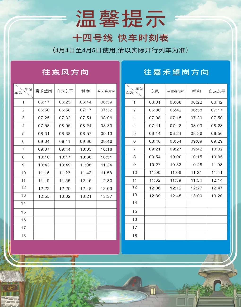 4月6日当天,十四号线13:30-21:00期间调整为大小交路运行模式,大交路运行区段为嘉禾望岗站-东风站,小交路运行区段为嘉禾望岗站-太平站。