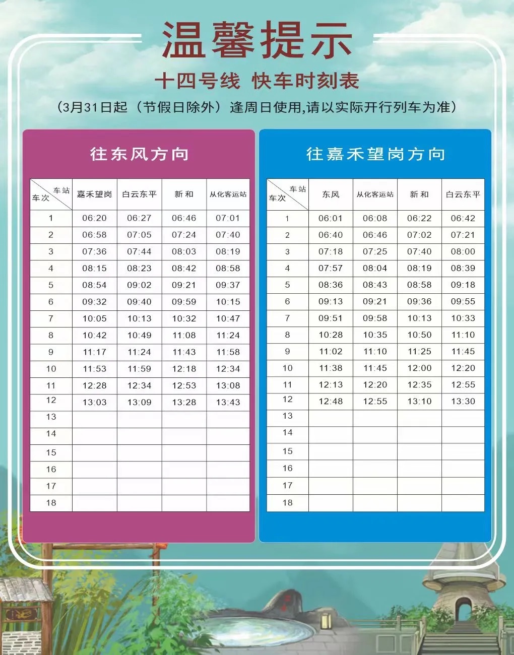 3月31日起,广州地铁十四号线(嘉禾望岗站至东风站)将采用周日专用运行图,增加列车上线、压缩行车间隔。