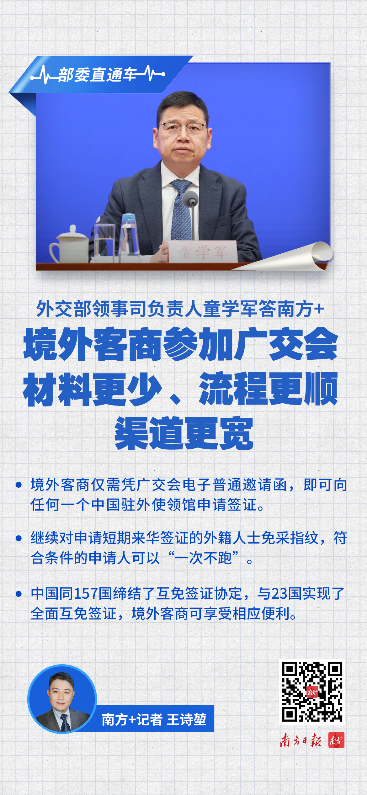 “全力保障中外人员往来是服务高水平对外开放的重要举措,外交部和中国驻外使领馆将继续为外籍人士来华提供优质高效的签证服务,我们也预祝第135届广交会圆满成功。”童学军说。