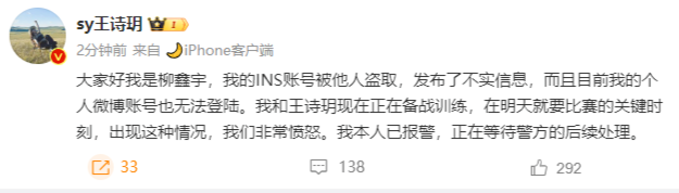 大家好我是柳鑫宇,我的INS账号被他人盗取,发布了不实信息,而且目前我的个人微博账号也无法登陆。我和王诗玥现在正在备战训练,在明天就要比赛的关键时刻,出现这种情况,我们非常愤怒。我本人已报警,正在等待警方的后续处理。