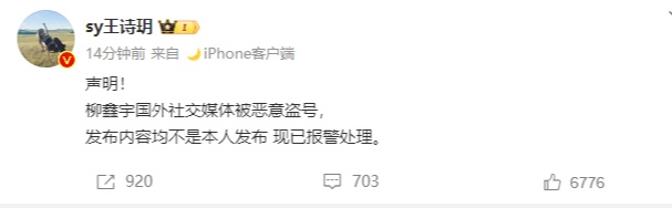 15时许,柳鑫宇借搭档@sy王诗玥微博发声,称国外社交媒体账号被盗,发布内容为不实信息,已经报警,等待警方后续处理。