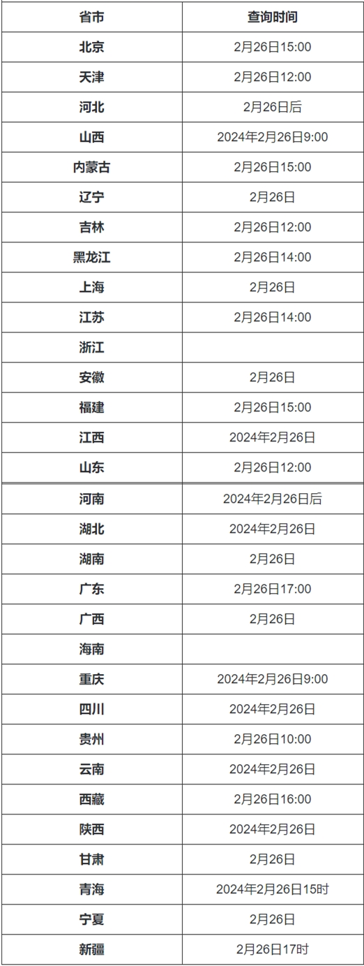 山西、重庆考生可于26日9时起查询;天津、吉林、山东考生可在26日12时起查询;黑龙江、江苏考生可以在26日14时起查询;北京、福建、青海、内蒙古考生可于26日15时起查询;广东、新疆考生可于26日17时起查询。