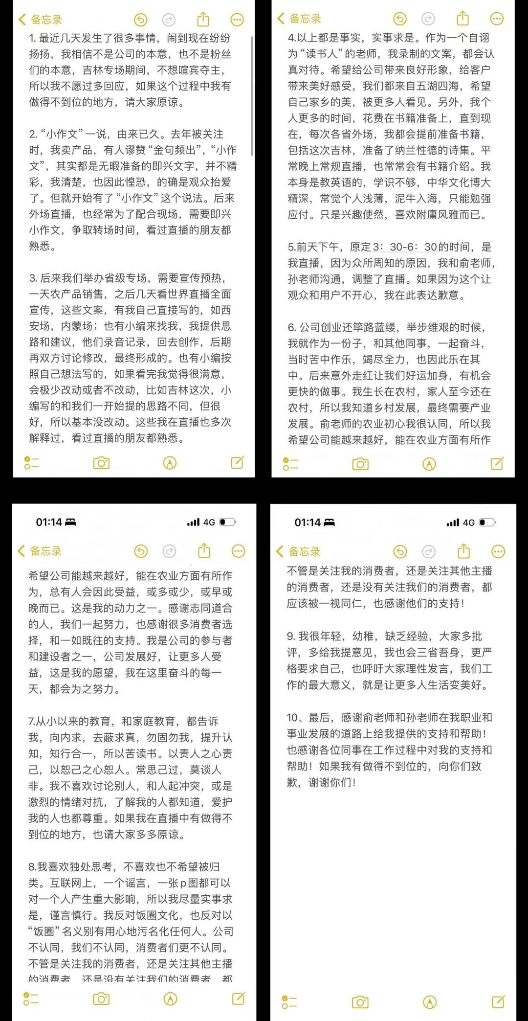“所谓的‘小作文’其实都是无暇准备的即兴文字,并不精彩。”董宇辉表示,由于此前卖产品被夸赞金句频出,就有了“小作文”的说法,后来外场直播,也常为了配合现场,需要即兴小作文,争取转场时间,“最近几天发生了很多事,闹得纷纷扬扬,相信不是公司的本意,也不是粉丝的本意。”