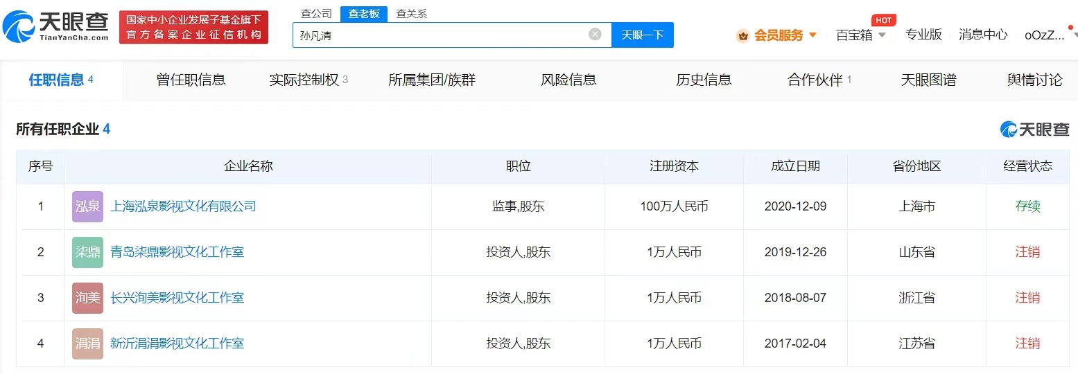 网友还通过天眼查、企查查等APP发现,宋祖儿(孙凡清)共关联4家企业,其中,由其个人独资的青岛柒鼎影视文化工作室、长兴洵美影视文化工作室、新沂涓涓影视文化工作室均已注销,目前仅剩上海泓泉影视文化有限公司1家为存续状态。