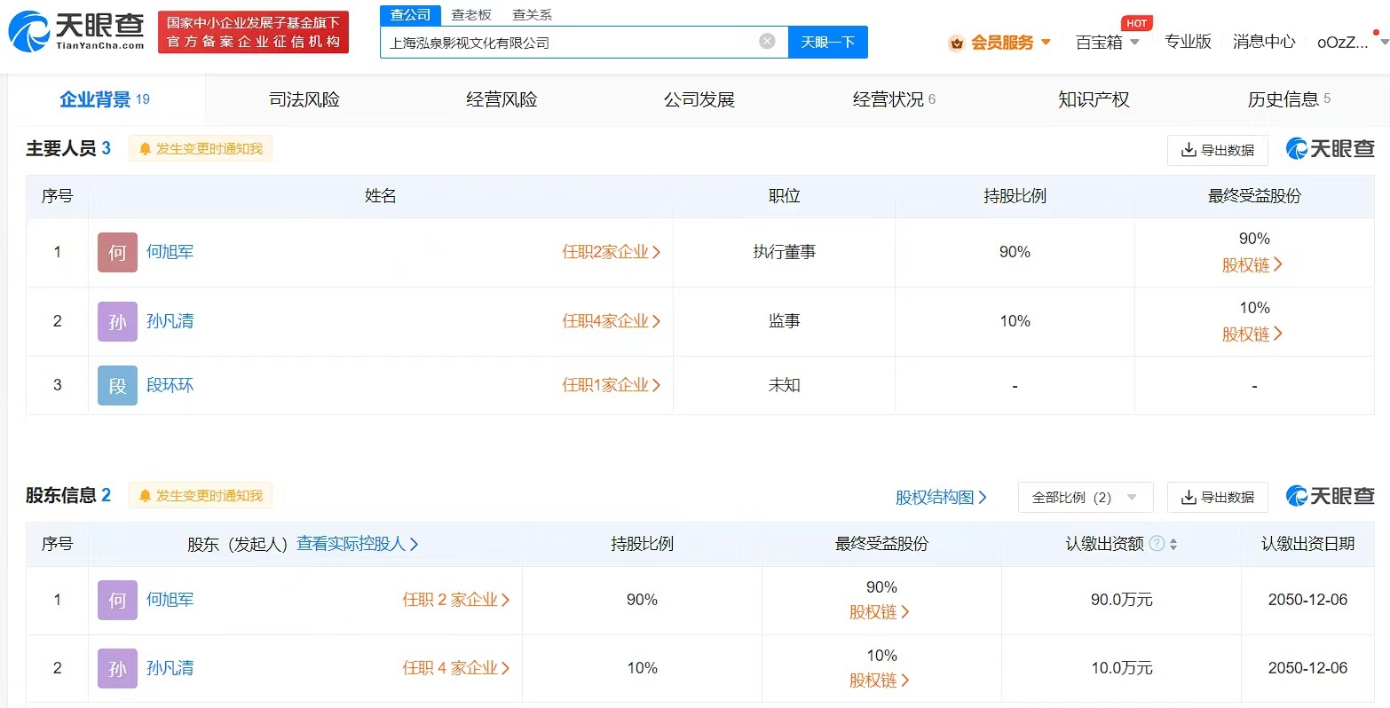 泓泉影视文化有限公司成立于2020年12月,注册资本100万人民币,法定代表人、执行董事、大股东为何旭军,宋祖儿担任监事并持股10%。年报信息显示,该公司参保人数为0。