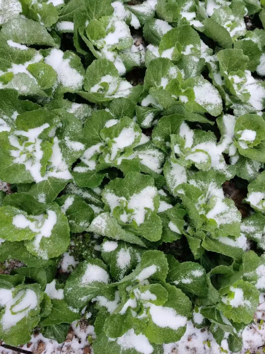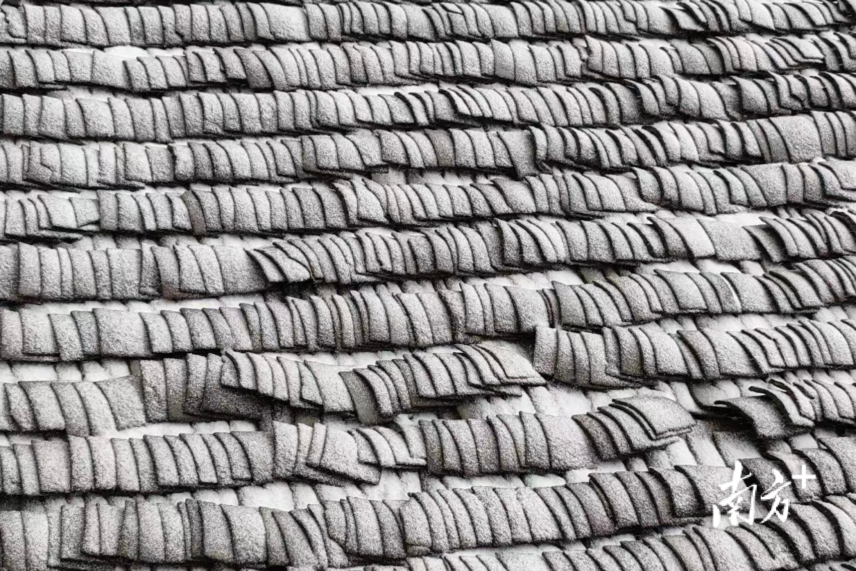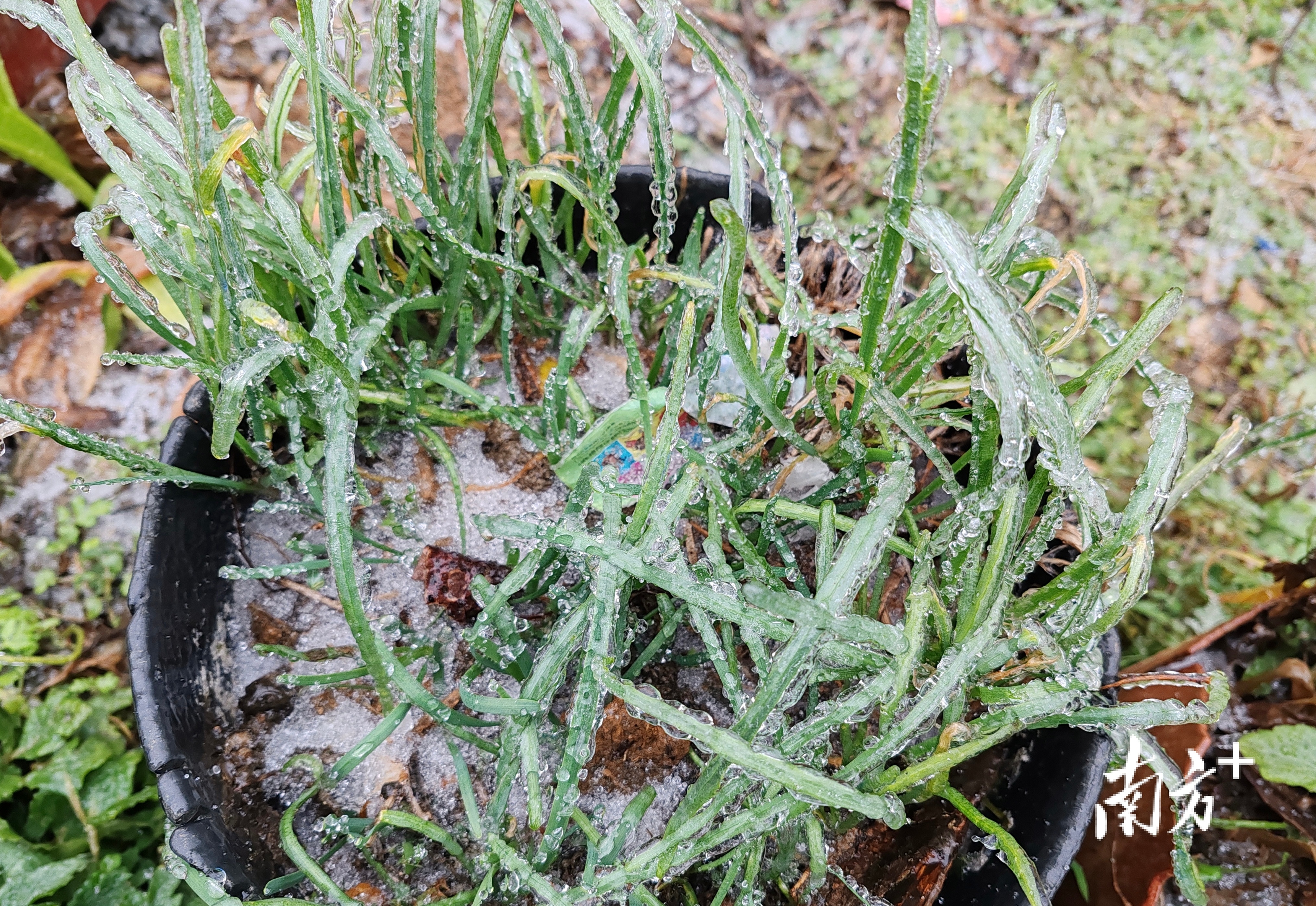 乐昌市沙坪镇地里的蔬菜裹“冰糖”,农户家的屋檐上积满一层白色的“冰碴子”,山上草木皆已被冰封。