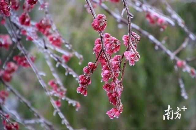 新丰县黄磜镇的唯美樱花雪,冰挂与绿叶红花相互映衬,形成一幅绝美的画卷,在这个寒冷的季节里,给人们带来了无尽的惊喜。