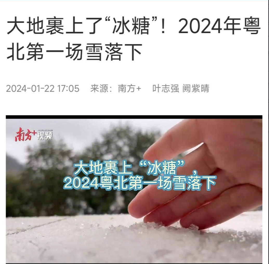 张颂文截图南方+文章《大地裹上“冰糖”,2024年粤北第一场雪落下》,向网友推荐韶关的雪。