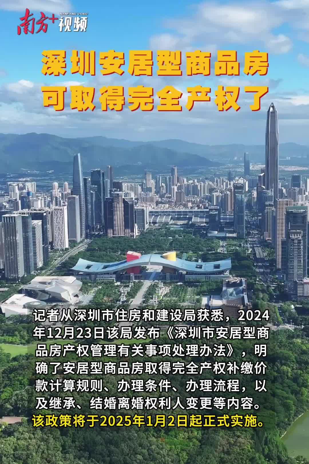 记者从深圳市住房和建设局获悉,2024年12月23日该局发布《深圳市安居型商品房产权管理有关事项处理办法》,明确了安居型商品房取得完全产权补缴价款计算规则、办理条件、办理流程,以及继承、结婚离婚权利人变更等内容。该政策将于2025年1月2日起正式实施。
