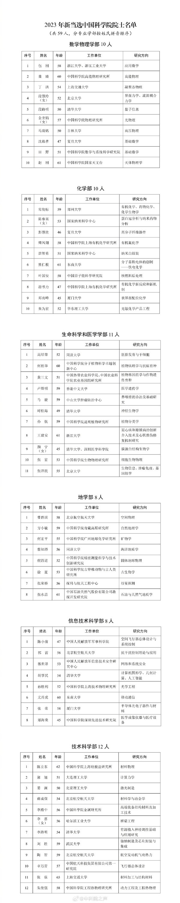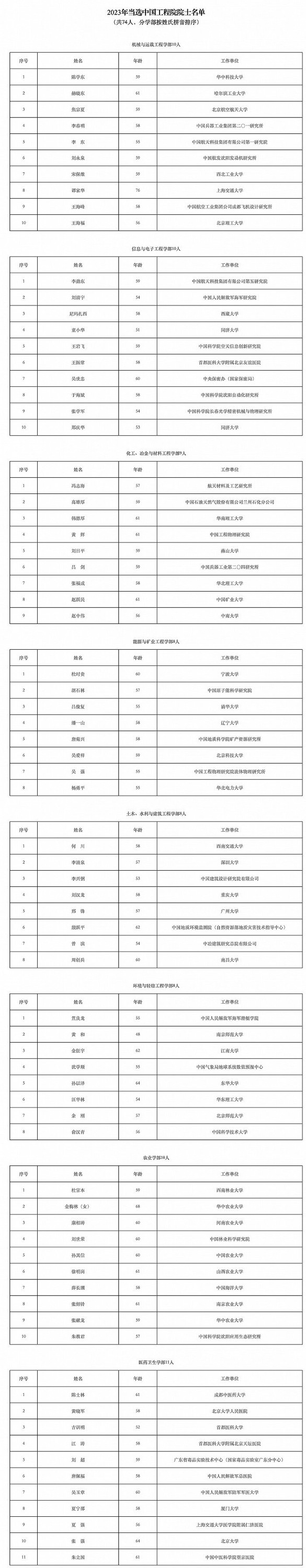 其中,中国工程院院士增选共选举产生74位中国工程院院士,中国科学院选举产生了59名中国科学院院士。
