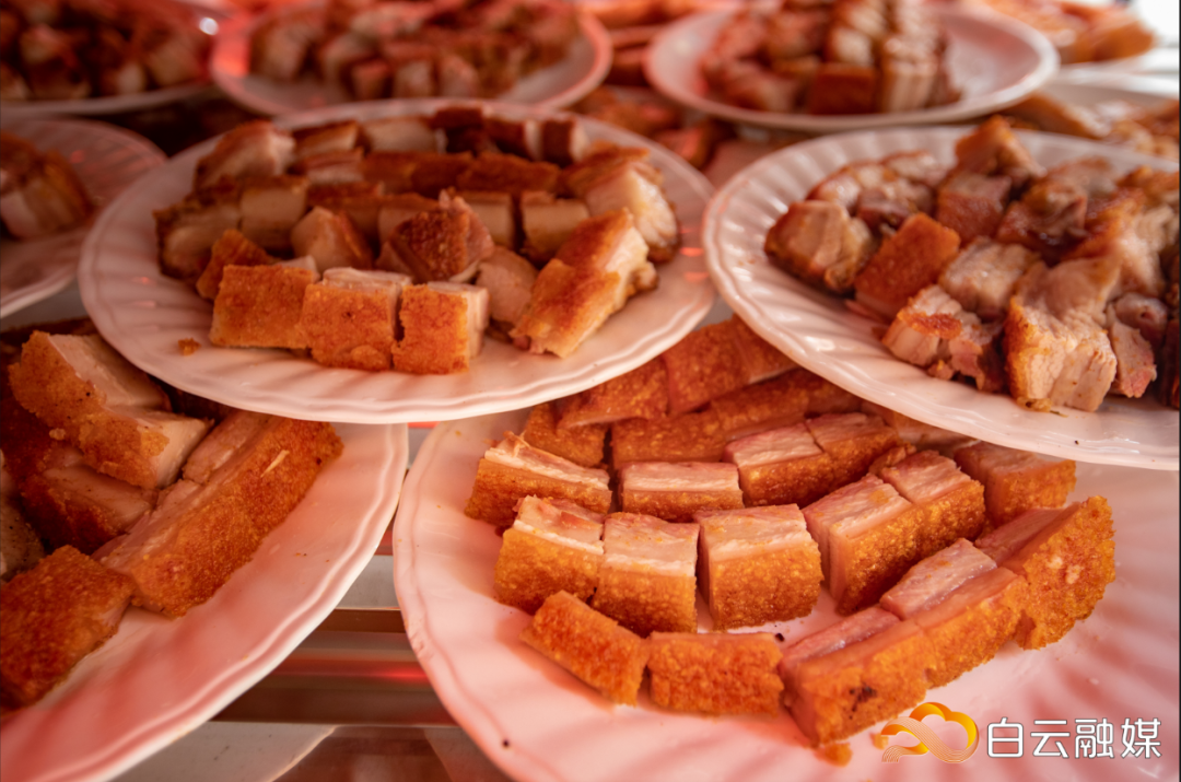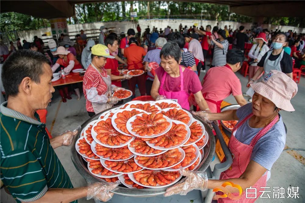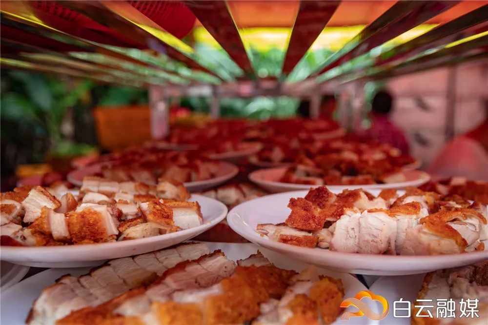 每围十个菜,除了脆皮烧肉、辣椒头菜花肉等传统的龙舟菜,也有白切鸡、白灼虾、鲍汁鲍鱼等传统粤菜,充分展示了蚌湖乡亲的待客热情。脆皮烧肉寓意身体健健康康,辣椒主要是起到祛湿作用,而头菜则寓意吃了龙舟饭的人可以“中头彩”。