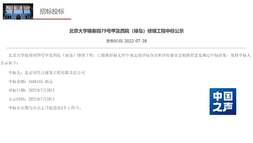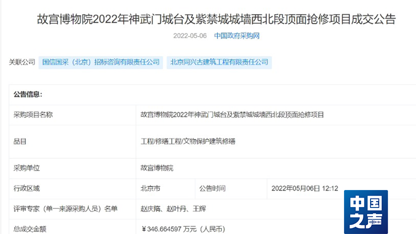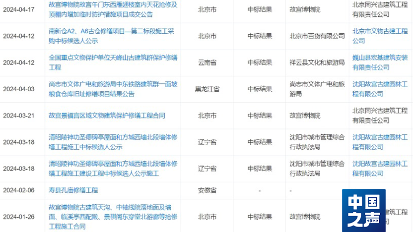 记者查询招标信息发现,2023年8月,河南政府采购网发布“河南大学河南留学欧美预备学校旧址大礼堂修缮工程项目-竞争性磋商公告” 。9月,北京同兴古建筑工程有限责任公司以4356000元中标该修缮工程项目。公司法定代表人徐长林接受中国之声记者独家采访时表示,他们公司成立于1999年,还曾中标过故宫博物院、清华大学、北京大学部分建筑的修缮工作。