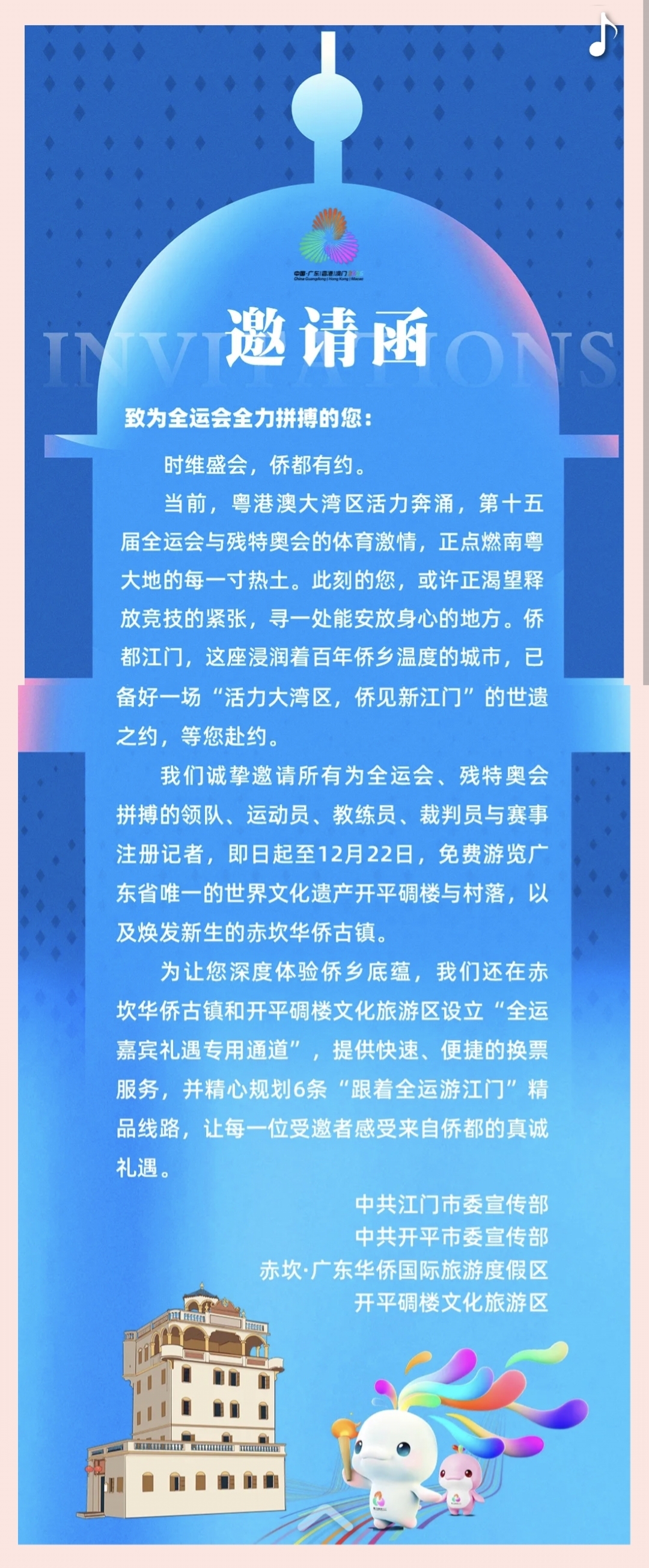 “赛事之余,欢迎走进江门,免费观赏广东省唯一的世界文化遗产开平碉楼与村落(自力村、立园、马降龙、锦江里,下同),畅游赤坎华侨古镇,深度品读独具魅力的岭南文化与华侨精神。”