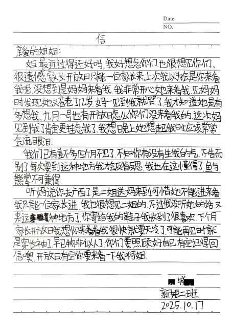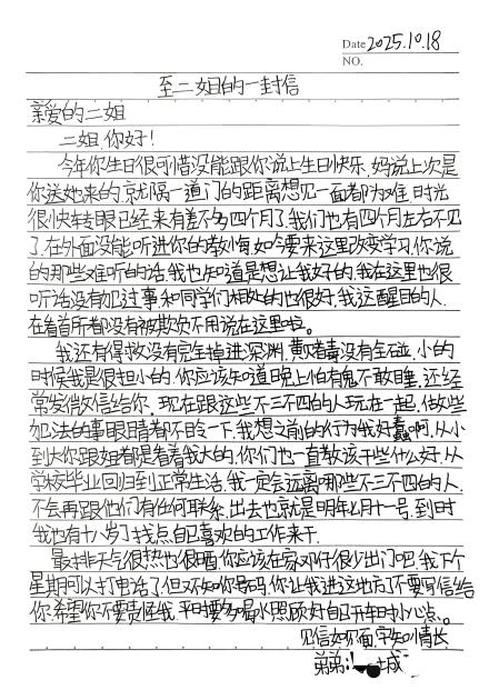 “姐,上次家长开放日我以为会是你来看我,没想到是妈妈。她一见到我就哭了,我才发现她眼角的皱纹又多了。你寄的那双鞋子我收到了,很合脚,天冷了我就穿着它晨跑。”小城同学的信里满是对姐姐的思念。