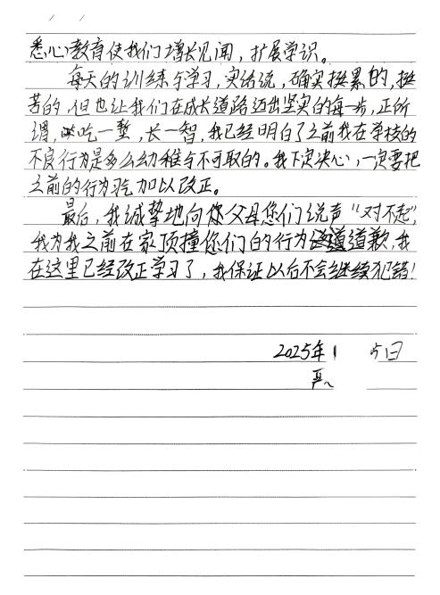 “亲爱的爸妈,我要跟你们说声‘对不起’。以前在家我总顶撞你们,在原来的学校还打架,让你们为我操心、花钱……来到这里后,我每天出早操、练军体拳,还学会了叠被子,教官还夸我叠得像‘豆腐块’。”小严同学的信里藏着小小的成就感。