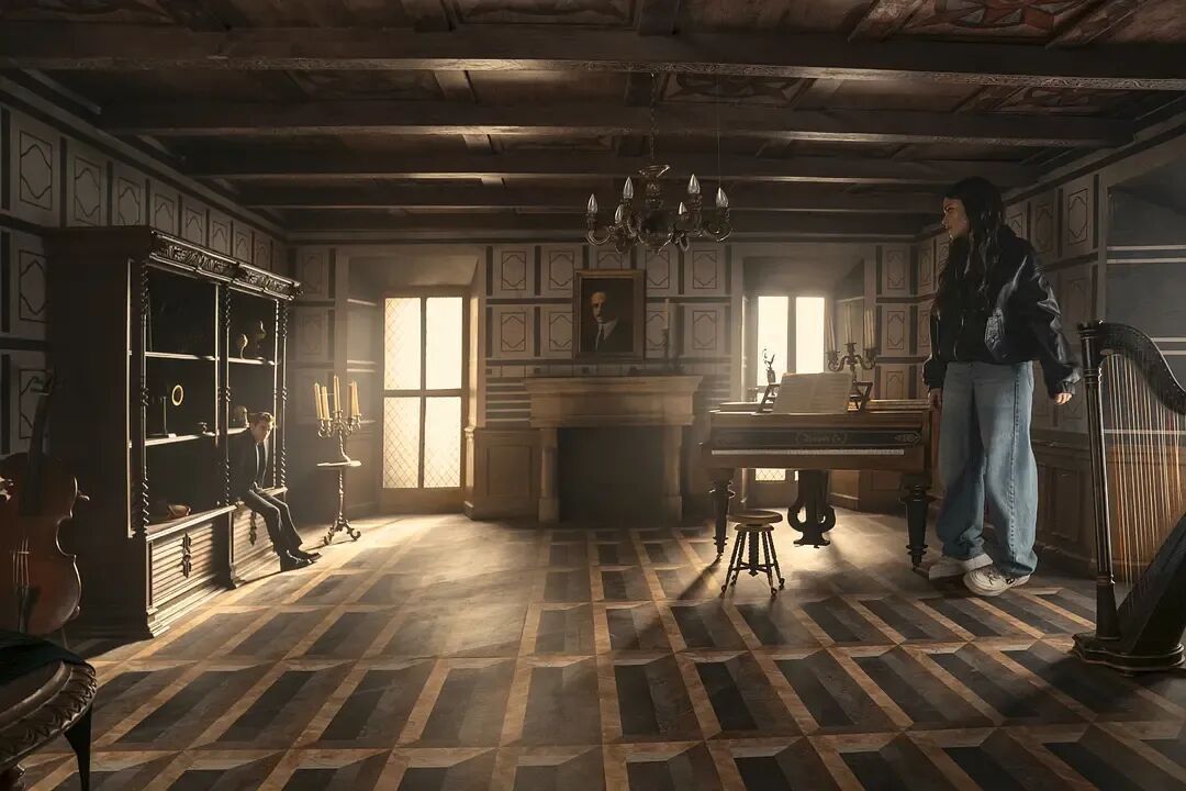 在一个遍布魔术道具的城堡中,有一段长镜头,新老魔术团成员逐一展现魔术技巧,进行了一场魔术battle,增进了彼此的感情。这一段的调度和运镜并不复杂,但是让一群影视演员在一镜到底的镜头中完成魔术表演,难度可想而知。