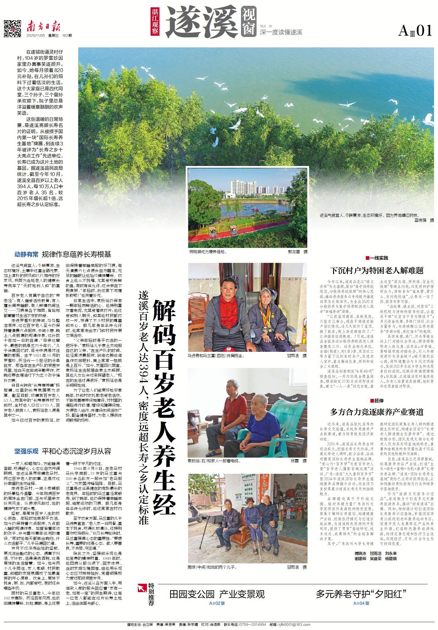 从被授予国内第一块“国际长寿养生基地”牌匾,到连续3年被评为“长寿之乡十大亮点工作”先进单位,长寿已成为这片土地的基因。据遂溪县民政局统计,截至今年10月,遂溪全县百岁以上老人394人,每10万人口中百岁老人35名,较2015年增长超1倍,远超长寿之乡认定标准。详情>>