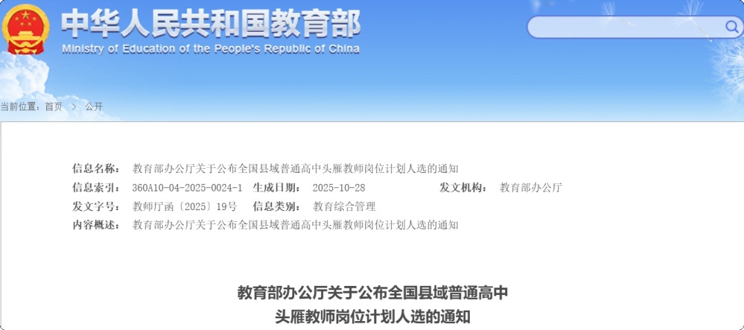 为深入贯彻落实《教育强国建设规划纲要(2024—2035年)》和《中共中央 国务院关于弘扬教育家精神加强新时代高素质专业化教师队伍建设的意见》,打造县域普通高中领军人才队伍,支撑县中全面振兴,根据《教育部办公厅关于实施全国县域普通高中头雁教师岗位计划的通知》(教师厅函〔2025〕10号)要求,经学校自主申报、省级教育行政部门审核公示、等额推荐、会议评议,确定首批全国县域普通高中头雁教师岗位计划入选教师600人,现将名单予以公布。