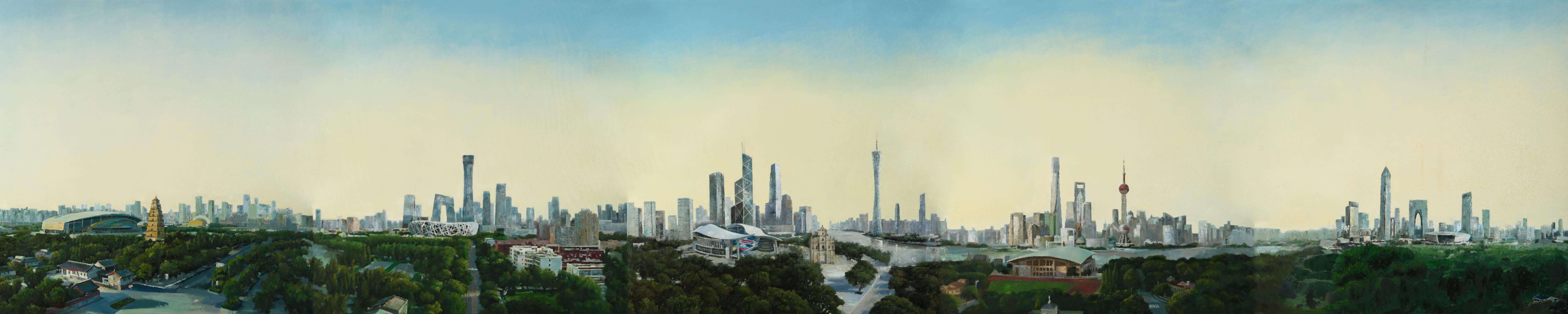 《全运之光》的创作创意体现在结构设计上,作品将曾举办全运会的北京、上海、天津、广州、西安五座城市地标与赛场,绘制于五块可分可合的画板上,以写实细腻的艺术手法串联起全运会的发展历程。蒙太奇的手法,时空交错,古典建筑和都市新地标夹杂,突出“光”的意象,象征荣誉、希望与体育精神的升华。作品没有在形式上展现体育竞技的激烈,而是在内涵上传递全运会的激情与粤港澳大湾区的蓬勃活力和希望。