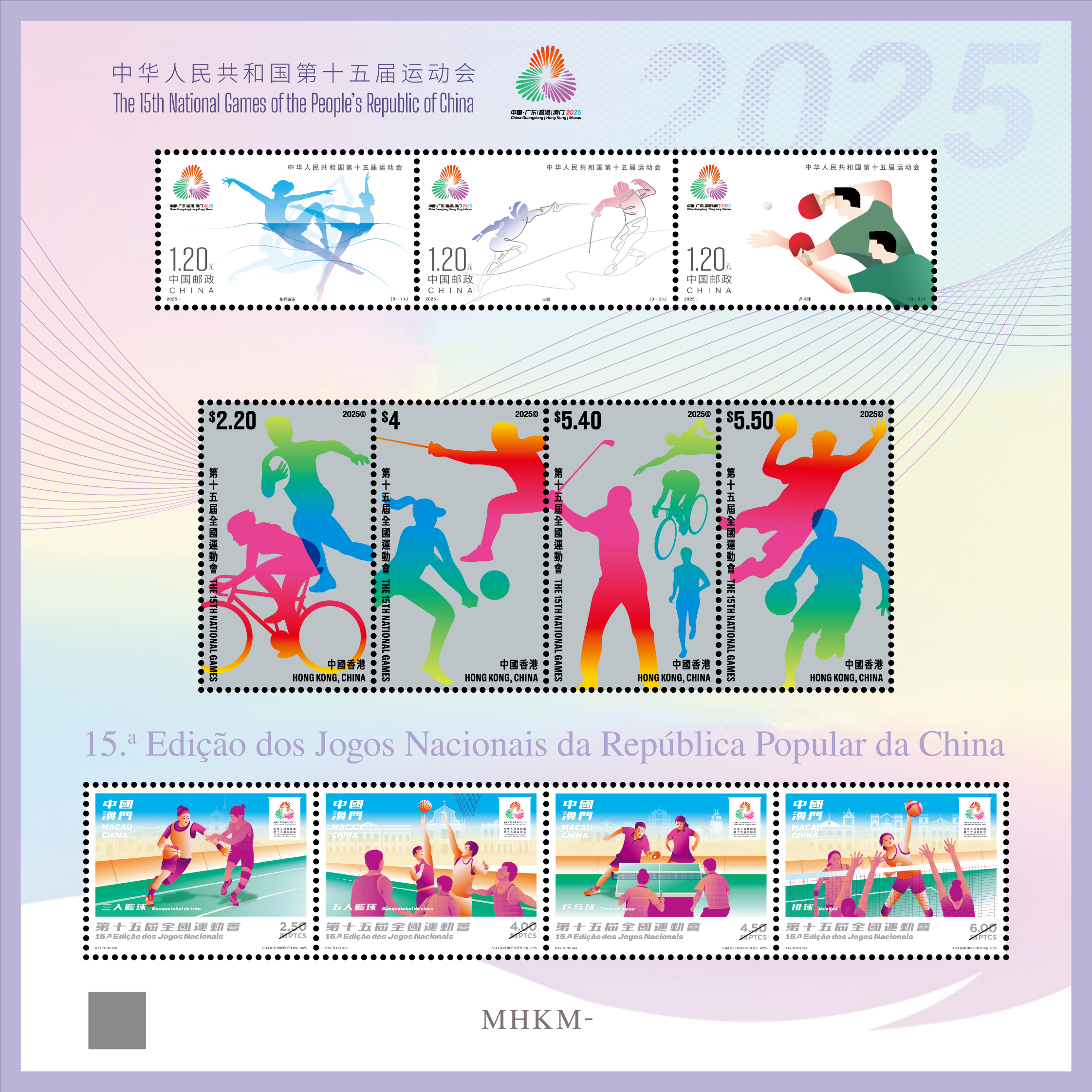 中华人民共和国第十五届运动会是粤港澳三地承办的我国规模最大、水平最高、影响最广的综合性运动会,也是香港、澳门首次承办全国运动会。为纪念此项体育盛会,中国邮政作为国家授权的邮票发行机构,在2025年11月9日正式发行《中华人民共和国第十五届运动会》纪念邮票一套3枚,并首次同步发行涵盖内地、香港、澳门三地邮票元素的《中华人民共和国第十五届运动会》三地小全张1枚。
