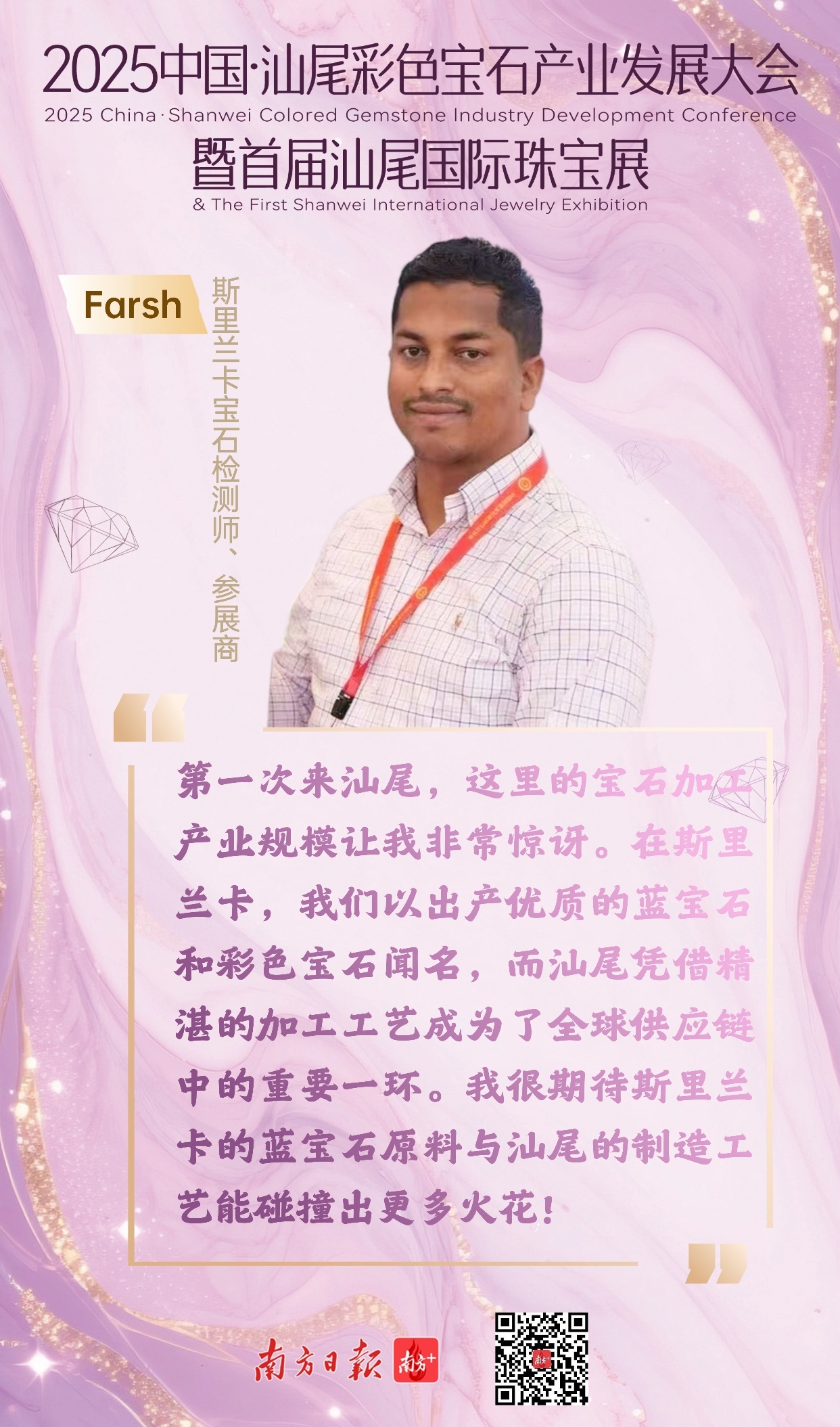 11月3日,2025中国汕尾彩色宝石产业发展大会暨首届汕尾国际珠宝展在海丰县闭幕。展会期间,行业大咖纷纷点赞汕尾珠宝。听听他们怎么说——采写:南方+记者 陈欣欣 陈保良海报:南方+记者 陈欣欣 南方日报、南方+客户端原创,未经授权不得转载 编辑 李恺莉校对 刘珺 订阅后可查看全文(剩余80%)