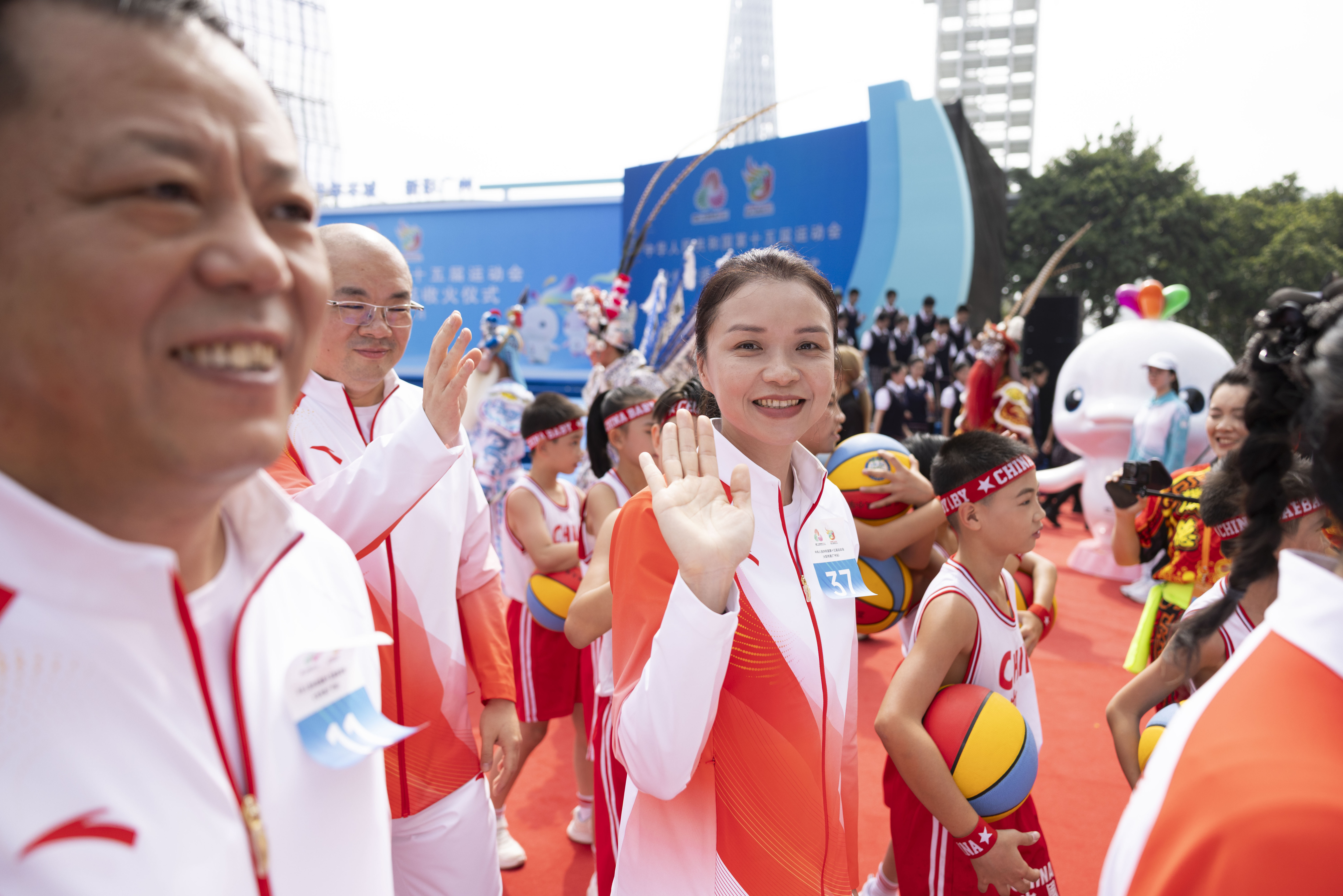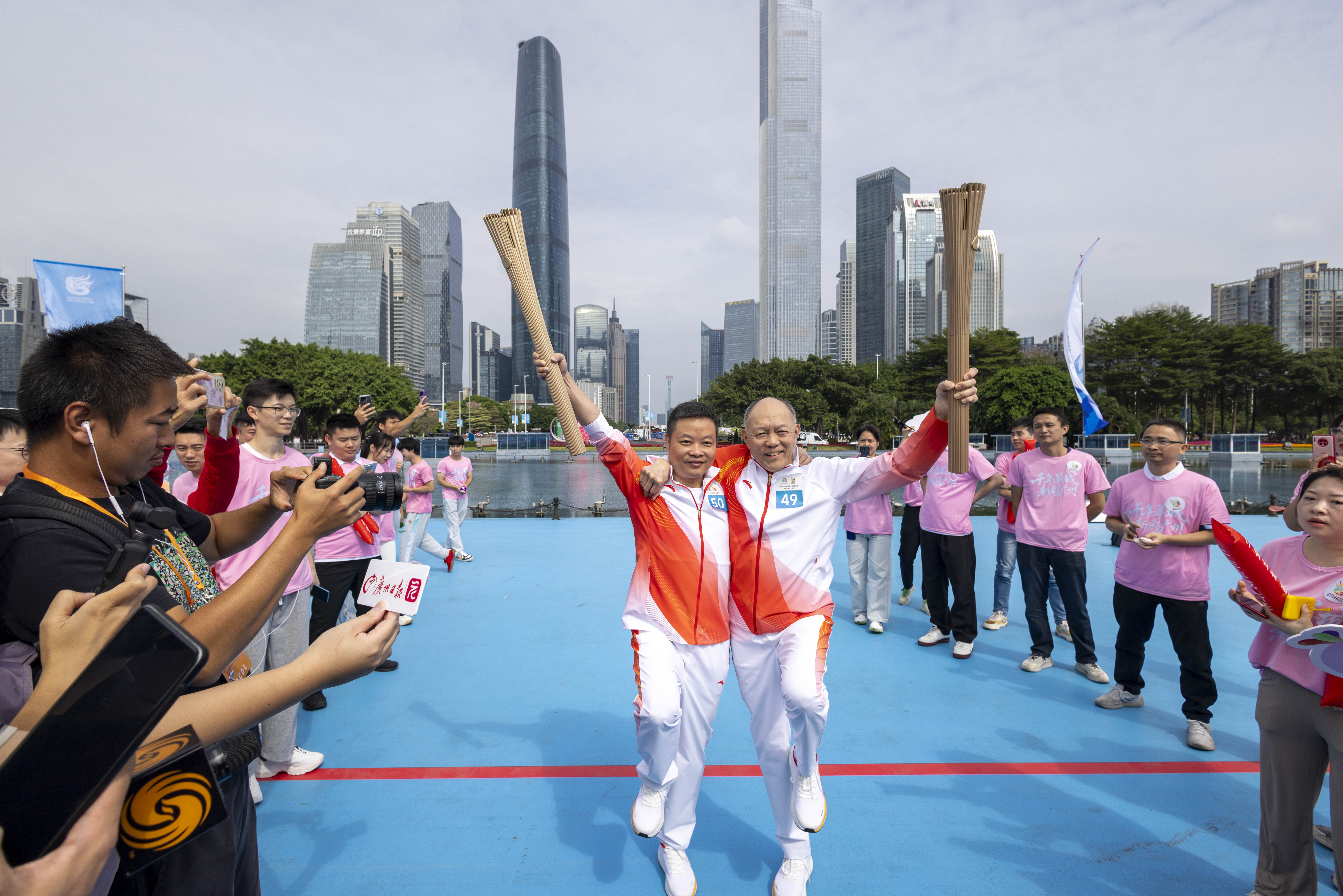 9时50分许,雅典奥运会男子双人10米跳台冠军、首位由广州市培养的跳水奥运会冠军杨景辉,手持象征“融”与“荣”的十五运火炬“绽放”,挥手向翘首以盼的市民致意,整座城市积蓄已久的热情被瞬间点燃。