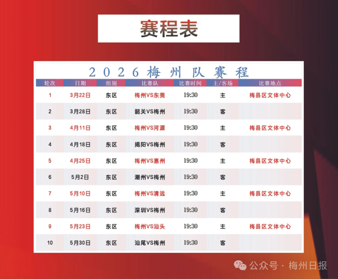 位于东区的梅州队,常规赛将进行5个主场、5个客场共10场比赛,对手依次为东莞队(3月22日,主场)、韶关队、河源队(4月11日,主场)、揭阳队、惠州队(4月25日,主场)、潮州队、清远队(5月10日,主场)、深圳队、汕头队(5月23日,主场)、汕尾队。