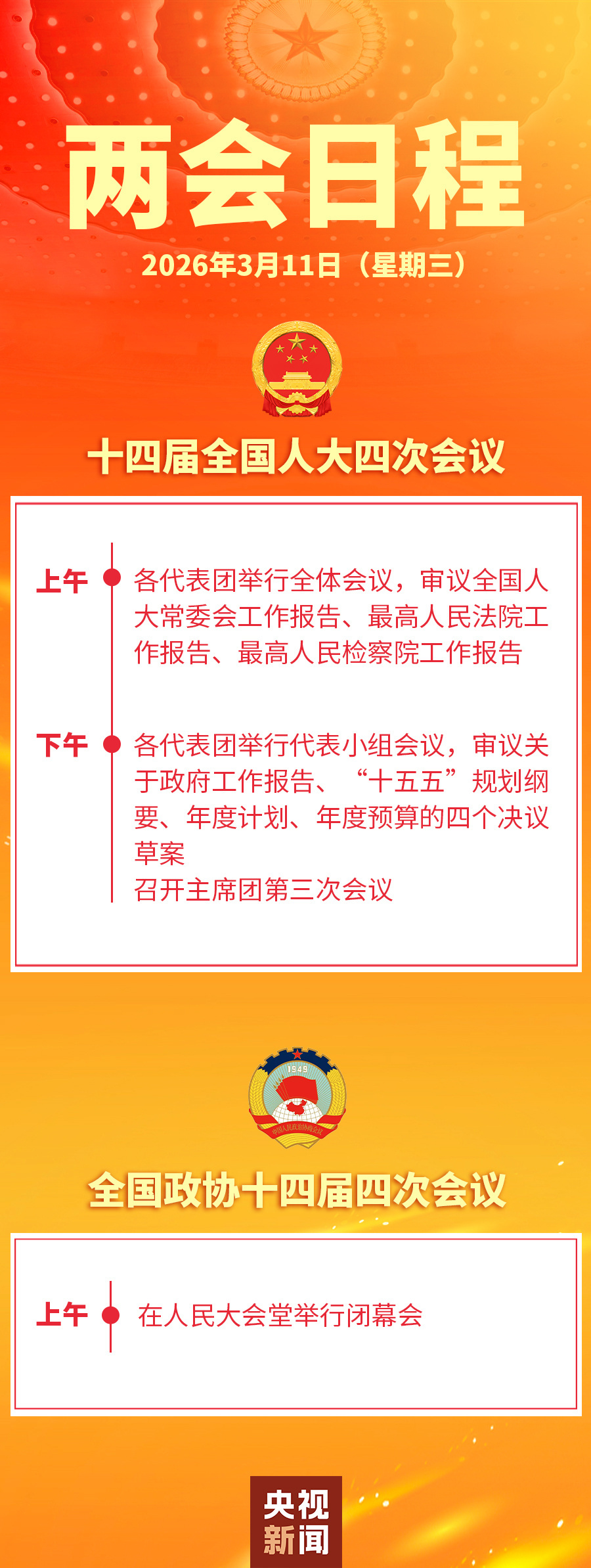 十四届全国人大四次会议各代表团11日上午举行全体会议,审议全国人大常委会工作报告、最高人民法院工作报告、最高人民检察院工作报告。下午,各代表团举行代表小组会议,审议关于政府工作报告、“十五五”规划纲要、年度计划、年度预算的四个决议草案;召开主席团第三次会议。