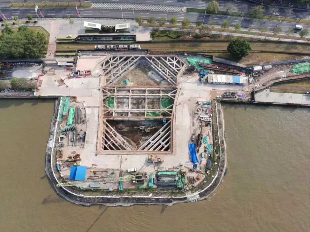项目沿线设连续下穿珠江及芳村大道南隧道一座、跨工业大道及规划一路路口的双分离立交一处,是集隧道、桥梁、道路于一体的综合性市政工程。目前,项目已完成荔湾对接端隧道主体结构施工,江中段沉管管节完成首次浇筑,正全面开展堤防修复及二次浇筑钢平台搭设工作。