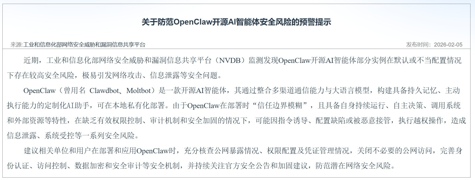 近日,工业和信息化部网络安全威胁和漏洞信息共享平台(NVDB)就监测发现了OpenClaw开源AI智能体部分实例在默认或不当配置情况下存在较高安全风险,极易引发网络攻击、信息泄露等安全问题。相关风险提示就指出,由于OpenClaw在部署时“信任边界模糊”,且具备自身持续运行、自主决策、调用系统和外部资源等特性,在缺乏有效权限控制、审计机制和安全加固的情况下,可能因指令诱导、配置缺陷或被恶意接管,执行越权操作,造成信息泄露、系统受控等一系列安全风险。工业和信息化部网络安全威胁和漏洞信息共享平台建议,相关单位和用户在部署和应用OpenClaw时,充分核查公网暴露情况、权限配置及凭证管理情况,关闭不必要的公网访问,完善身份认证、访问控制、数据加密和安全审计等安全机制,并持续关注官方安全公告和加固建议,防范潜在网络安全风险。