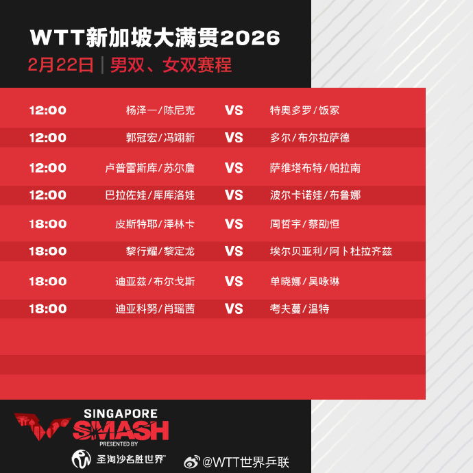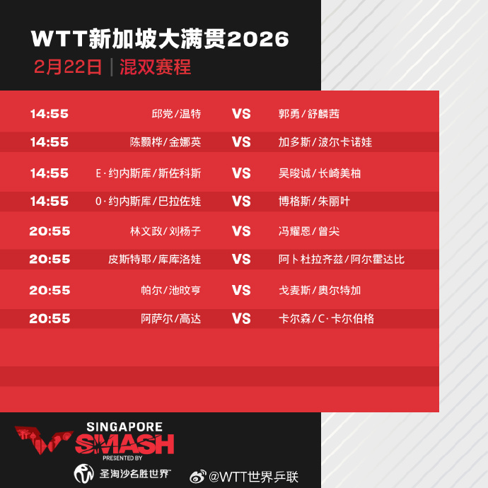 今天(22日),2026年WTT新加坡大满贯正赛打响,首日国乒8人出战,具体赛程如下: