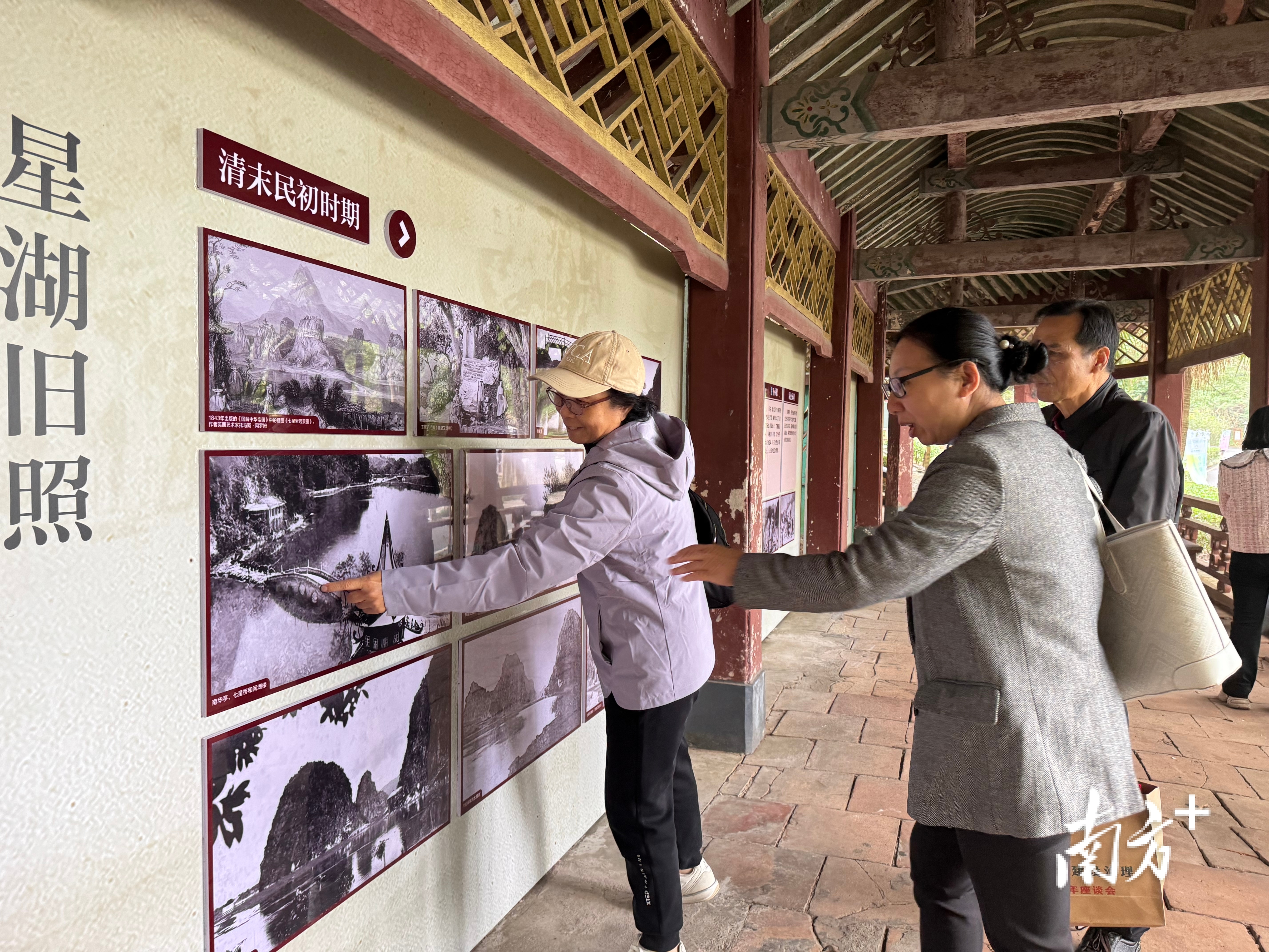 考察组一行抵达丹顶鹤岛,但见鹭鸟翩跹,听到鹤鸣声声,湿地生态保护成效显著。在桂苑长廊的“七星岩治水与生态变迁”图片展前,老同志们指着旧照片兴奋地回忆:“这是七星桥、那是聚星桥,是我们以前上班的必经之路……”