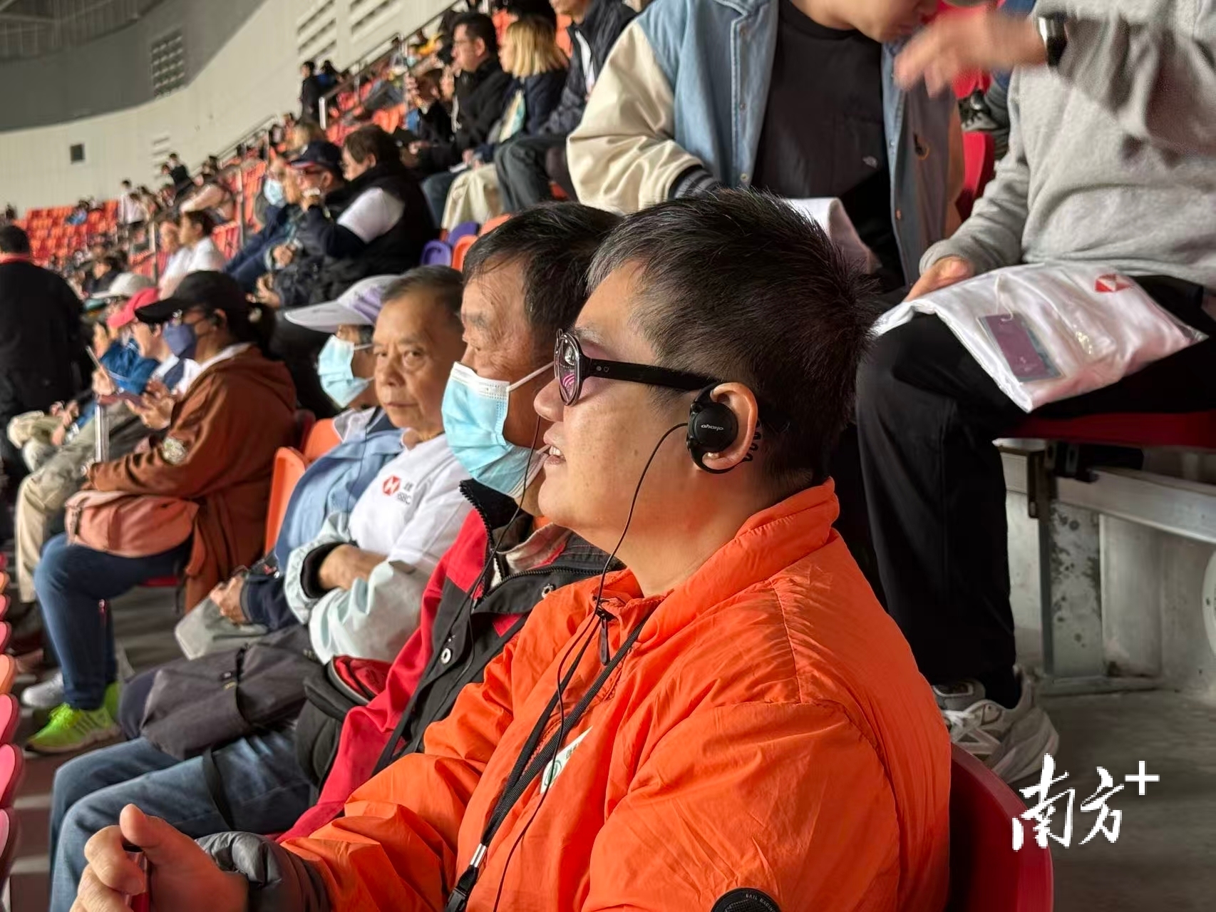 视障人士戴上耳机在比赛现场收听口述赛况。