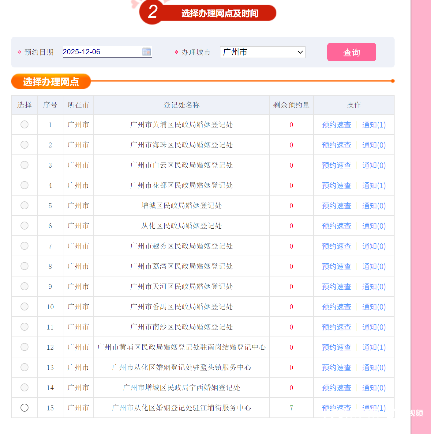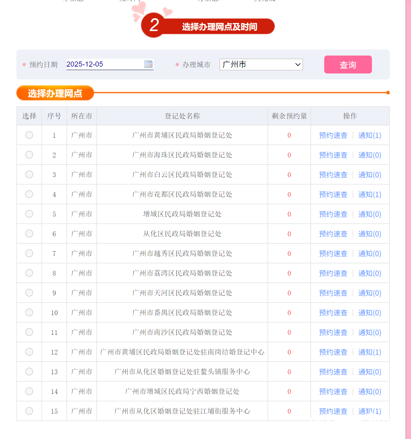 12月1日上午,南都记者在广东民政婚姻登记网上预约系统看到,以广州为例,本周工作日结婚预约号量较为充足,而到了周六,结婚预约号则只剩下其中一个登记处有少量号源。